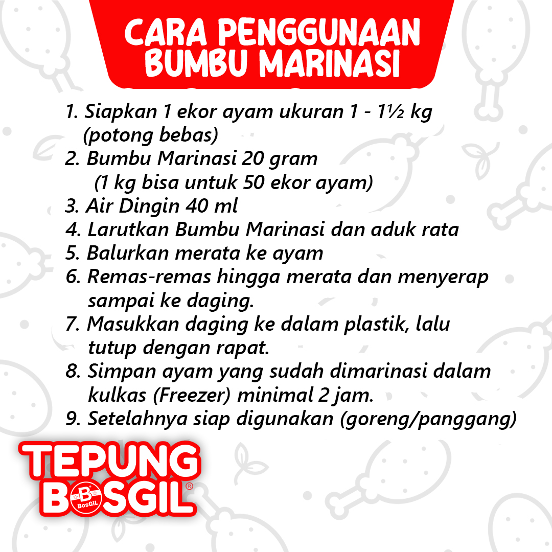 Bumbu Marinasi Original adalah bumbu yang dicampurkan ke daging ayam untuk memberikan rasa yang lebih gurih dan bumbu lebih meresap dalam membuat Ayam Fried Chicken